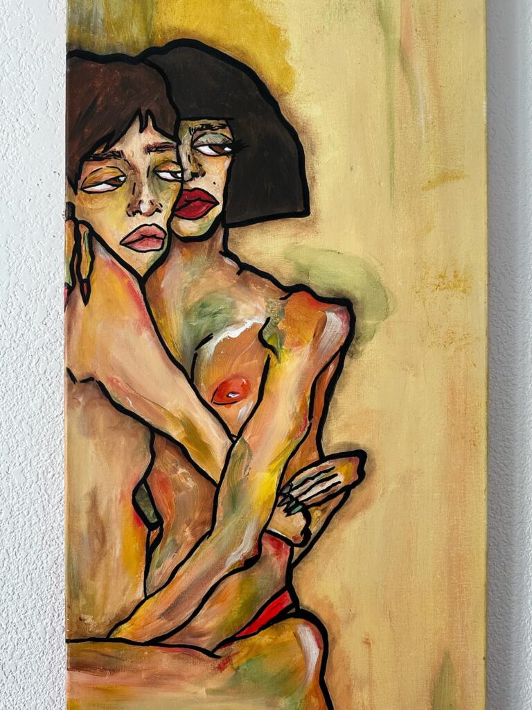 Mon inspiration puise sa source dans la figure féminine et l'indicible, ce que le corps exprime quand les mots font défaut. Au début, mes toiles étaient des autoportraits inconscients. Je vivais une période de transition majeure et la peinture accompagnait cette mue en représentant celle que j'étais, celle que je devenais et celle que j'aspirais à être. Aujourd'hui, je suis inspirée par la femme sous toutes ses formes. Je m'éloigne des représentations lisses et clichées pour explorer des corps nus, tordus ou marqués, mais toujours bruyants de vérité. Mon travail est une exploration des sentiments et vécus à travers le corps et ses postures.